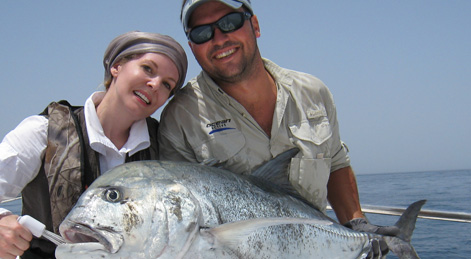 The Musandam Peninsula is the most northerly region in Oman. It is separated from the rest of the country by the United Arabs Emirates. Kathryn traveled to this exotic area, which is recognizable by the Hajar mountain range, whose cliff faces jut out into the sea of Hormuz in her quest for Giant Trevally. They are more frequently called GT’s, but as a result of an unprecedented battle with the giant, this formidable opponent has been more appropriately renamed, "The Kong", the hardest surface hitting, strongest pulling game fish on the planet.